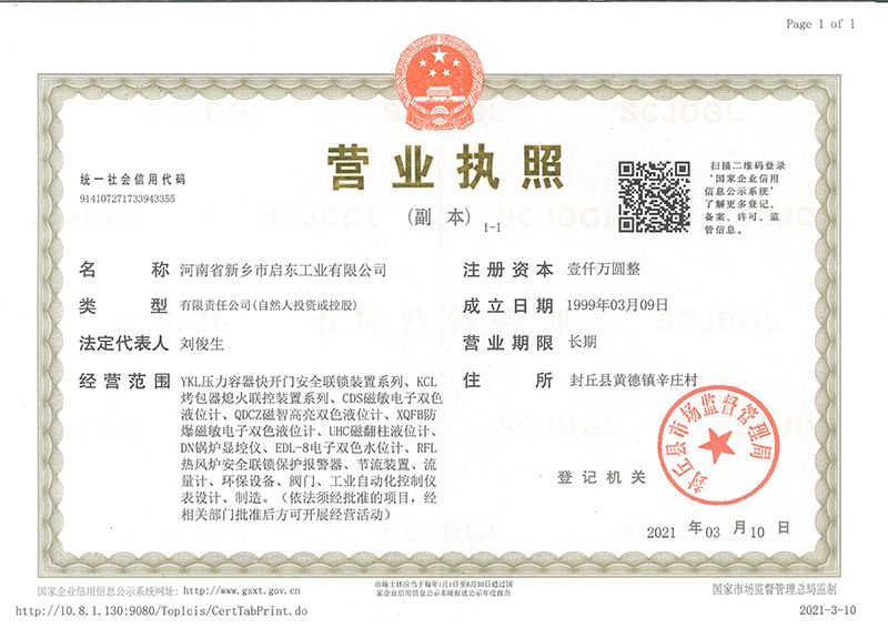 河南省新鄉(xiāng)市啟東工業(yè)有限公司始建于1987年,是專注研發(fā)、生產(chǎn)自動化儀器儀表(主要與壓力容器、鍋爐等容器配套使用)的廠家。主要產(chǎn)品有液位計(磁敏雙色型、磁翻柱型等)系列、烤包器熄火聯(lián)控裝置系列、壓力容器快開門安全聯(lián)鎖保護裝置系列、鍋爐報警器系列。二十多年來,公司產(chǎn)品暢銷國內(nèi)并遠銷俄羅斯、蒙古與東南亞,深得廣大用戶的信賴和好評。我們多年來致力于自動化儀器儀表的研制生產(chǎn),公司現(xiàn)具有完善的生產(chǎn)、試驗、檢測手段和設備。科技創(chuàng)新、誠信服務,是我們不變的經(jīng)營理念,我們將以強有力的技術支持及售后竭誠為客戶提供良好的服務。  2012年我公司成功研發(fā)了KCL系列烤包器熄火聯(lián)控裝置,并于2013年2月2日榮獲中華人民共和國國家知識產(chǎn)權局辦法的《實用新型**證書》<**號:2021202257735>該產(chǎn)品廣泛應用于唐鋼等大型鋼鐵企業(yè),為烤包器安全作業(yè)提供了有力的保障。  2002年我公司成功研發(fā)磁敏電子雙色液位計獨特的高亮度LED紅綠雙色顯示,獲得了專家的首肯和用戶的一致好評。在此基礎上我公司研發(fā)人員十年磨一劍,致力于XQFB-1防爆型磁敏雙色液位計的研發(fā),于2013年12月27日由國家防爆電器產(chǎn)品質(zhì)量監(jiān)督檢驗中心檢驗合格并頒發(fā)防爆合格證書<編號:cnex19.0883>。該產(chǎn)品性能得到了充分的發(fā)揮,廣泛應用于含有Ⅱ類A·B級T1-T4組可燃氣體或蒸汽與空氣混合形成的爆炸性混合物的0區(qū)、1區(qū)危險場所。連接用戶DCS或PLC系統(tǒng)實現(xiàn)遠距離集中顯示和控制,從而實現(xiàn)節(jié)能、數(shù)字化管理。為用戶增加了一定的經(jīng)濟效益和社會效益,。2014年公司成功申請了夢潤儀表的logo,新的品牌新的形象,夢潤儀表是啟東的LOGO, 歡迎新老用戶前來洽談合作。  我們一如既往地注重科研的投入,憑借產(chǎn)品的不斷更新、加大科技含量,進一步拓展市場。我們相信品質(zhì)成就未來,以過硬質(zhì)量、優(yōu)惠價格、完善的售后服務熱忱歡迎廣大客戶來我司視察指導、洽談業(yè)務;精誠合作,共創(chuàng)輝煌!